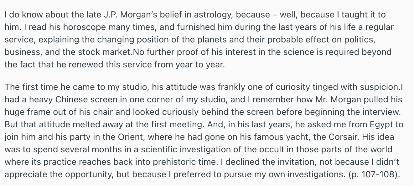 The same impulse animated both Gilded Ages, the late 1800s and the 1920s, when séances and psychics sold elites access to hidden knowledge. J.P. Morgan was fascinated by Astrology because he was looking for mystical edge in business: